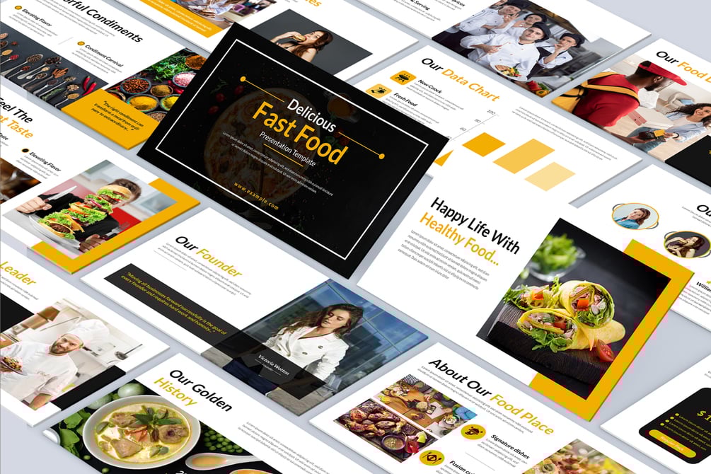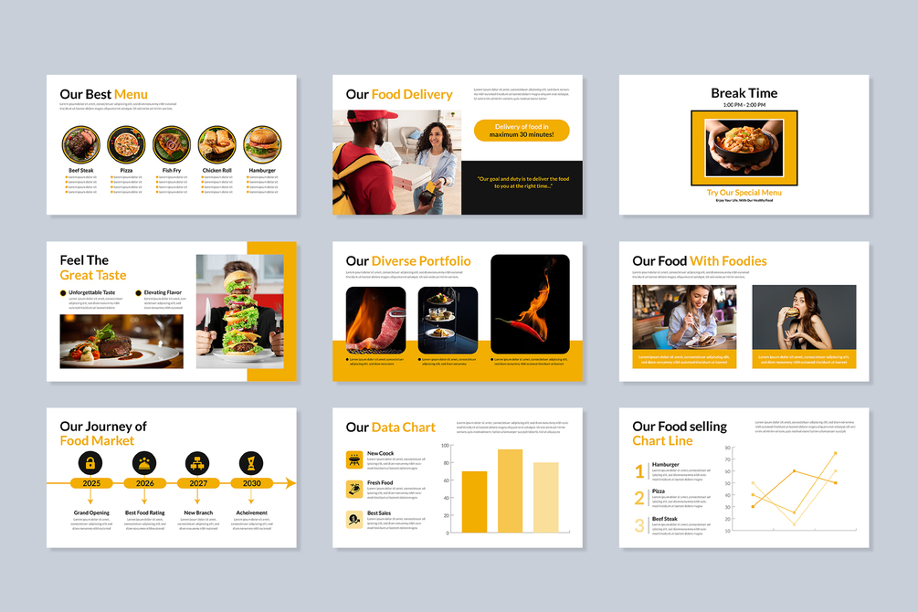 Make your culinary presentations stand out with the Food PowerPoint Presentation Template, perfect for restaurants, food businesses, chefs, and nutrition experts. Featuring over 24 unique slides, this template allows you to creatively showcase menu items, food concepts, recipes, and nutritional plans with a professional and vibrant design. Fully compatible with Microsoft PowerPoint and Adobe Illustrator, the template is designed for easy customization. It offers drag-and-drop photo replacement, master slide layout, and one-click theme color change to simplify the editing process. Whether you’re presenting to clients, investors, or colleagues, this food presentation template helps communicate your message effectively and beautifully.