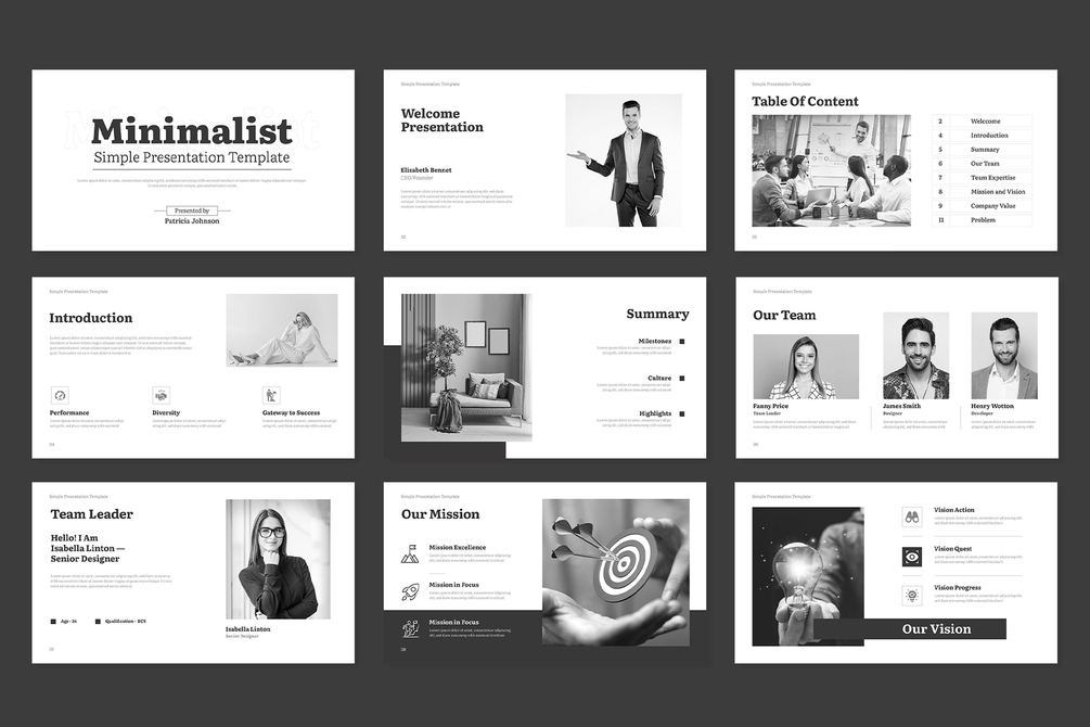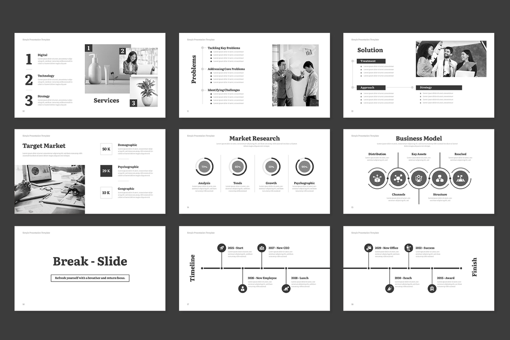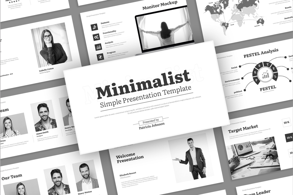 Create professional and straightforward business presentations with our Simple & Minimal PowerPoint Presentation Template. This template is compatible with Microsoft PowerPoint and Adobe Illustrator and includes more than 30 unique slides tailored to business topics. Effortlessly customize with drag-and-drop photo replacement, master slide layouts, and a theme color option for one-click color changes. Perfect for conveying your ideas with clarity and style.